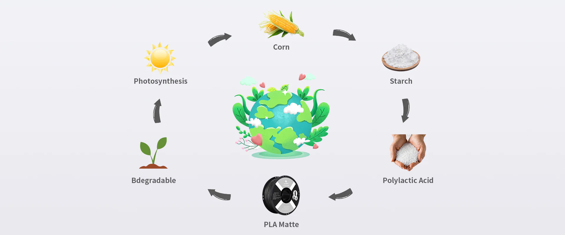 PLA Matte is a biological material, made from starch raw material of renewable plant resources, with a low melting temperature, even does not even need a heated bed. It is odorless, pollution-free, and harmless to humans during printing.